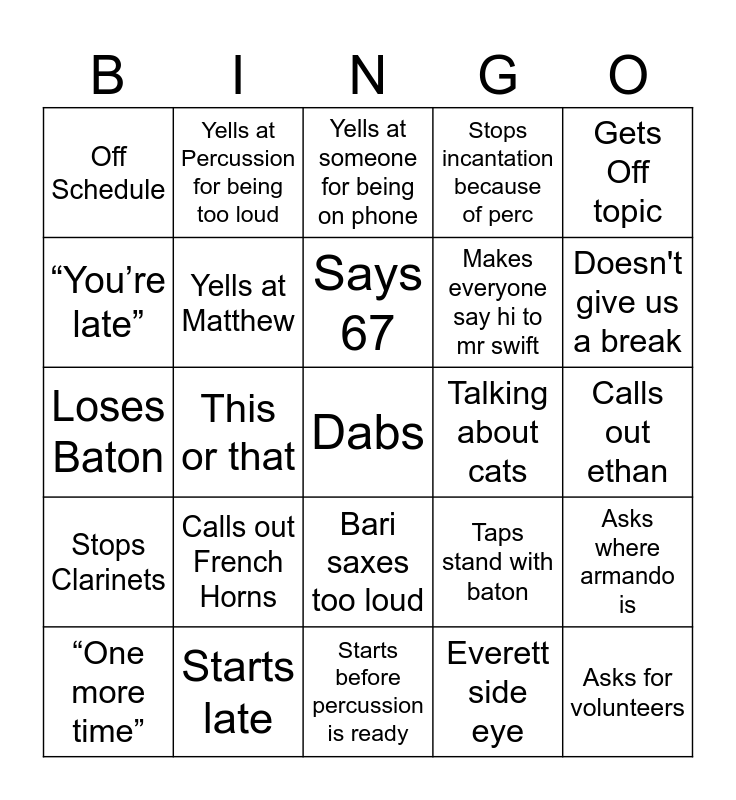 This bingo card has 25 words: Calls out French Horns, Starts before percussion is ready, Says 67, “One more time”, Gets Off topic, Off Schedule, “You’re late”, Yells at Percussion for being too loud, Talking about cats, Bari saxes too loud, Makes everyone say hi to mr swift, Loses Baton, Taps stand with baton, Asks where armando is, Yells at Matthew, Asks for volunteers, Calls out ethan, Yells at someone for being on phone, Doesn't give us a break, This or that, Dabs, Starts late, Stops Clarinets, Stops incantation because of perc and Everett side eye.
