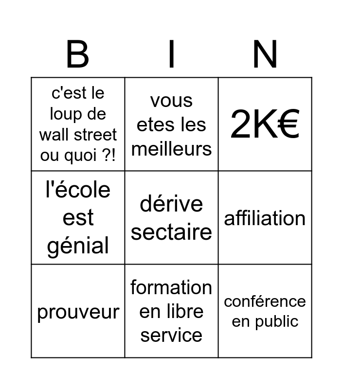 This bingo card has a free space and 8 words: affiliation, 2K€, vous etes les meilleurs, prouveur, c'est le loup de wall street ou quoi ?!, conférence en public, l'école est génial and formation en libre service.