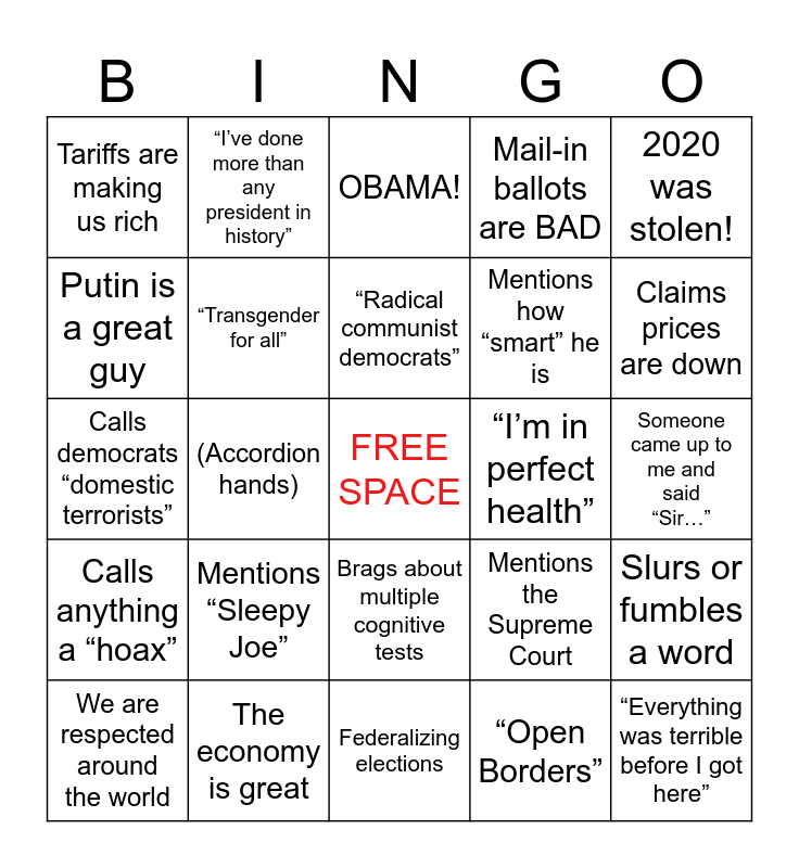 This bingo card has a free space and 24 words: Mentions “Sleepy Joe”, The economy is great, “Radical communist democrats”, We are respected around the world, 2020 was stolen!, Tariffs are making us rich, Putin is a great guy, “I’ve done more than any president in history”, “I’m in perfect health”, Brags about multiple cognitive tests, Mentions how “smart” he is, Calls democrats “domestic terrorists”, Mentions the Supreme Court, Slurs or fumbles a word, “Transgender for all”, “Open Borders”, Someone came up to me and said “Sir…”, OBAMA!, Claims prices are down, (Accordion hands), “Everything was terrible before I got here”, Calls anything a “hoax”, Mail-in ballots are BAD and Federalizing elections.