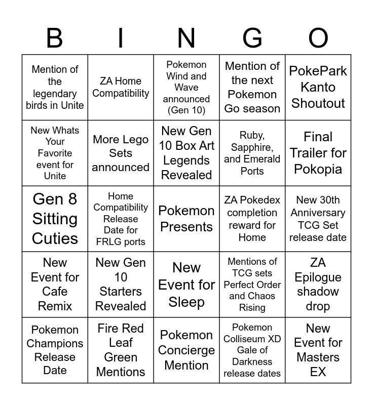 This bingo card has a free space and 24 words: New Gen 10 Starters Revealed, Fire Red Leaf Green Mentions, New Gen 10 Box Art Legends Revealed, Pokemon Champions Release Date, PokePark Kanto Shoutout, Mention of the legendary birds in Unite, New Whats Your Favorite event for Unite, ZA Home Compatibility, ZA Pokedex completion reward for Home, New Event for Sleep, Ruby, Sapphire, and Emerald Ports, Gen 8 Sitting Cuties, Mentions of TCG sets Perfect Order and Chaos Rising, ZA Epilogue shadow drop, More Lego Sets announced, Pokemon Colliseum XD Gale of Darkness release dates, New 30th Anniversary TCG Set release date, Pokemon Wind and Wave announced (Gen 10), Final Trailer for Pokopia, Home Compatibility Release Date for FRLG ports, New Event for Masters EX, New Event for Cafe Remix, Mention of the next Pokemon Go season and Pokemon Concierge Mention.