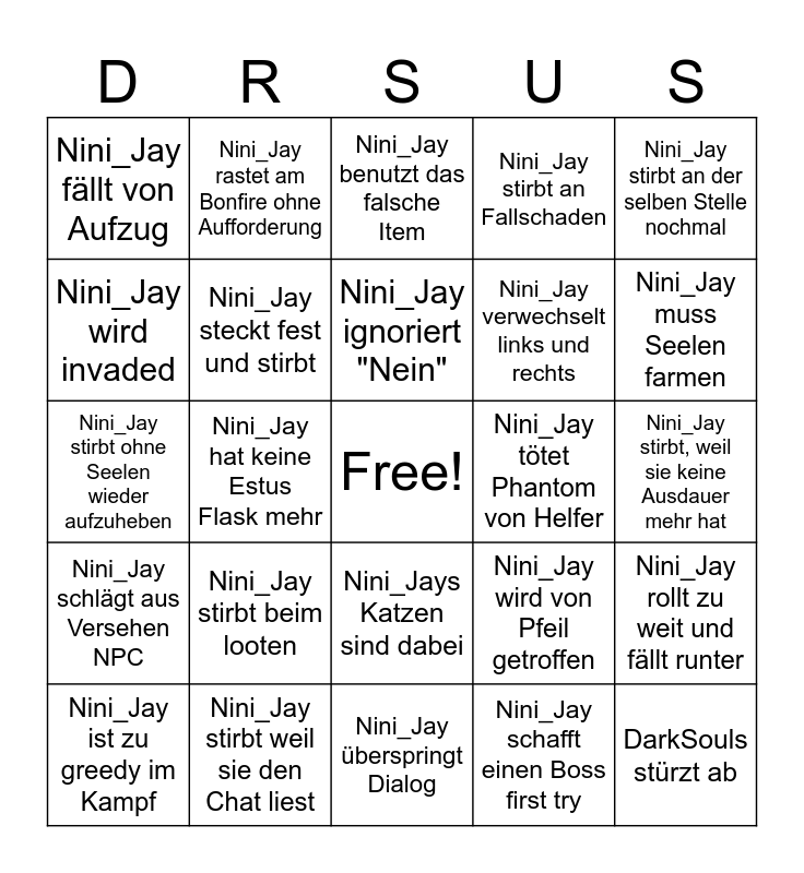 This bingo card has a free space and 24 words: Nini_Jay stirbt beim looten, Nini_Jay stirbt weil sie den Chat liest, Nini_Jay ignoriert "Nein", Nini_Jay ist zu greedy im Kampf, Nini_Jay stirbt an der selben Stelle nochmal, Nini_Jay fällt von Aufzug, Nini_Jay wird invaded, Nini_Jay rastet am Bonfire ohne Aufforderung, Nini_Jay tötet Phantom von Helfer, Nini_Jays Katzen sind dabei, Nini_Jay verwechselt links und rechts, Nini_Jay stirbt ohne Seelen wieder aufzuheben, Nini_Jay wird von Pfeil getroffen, Nini_Jay rollt zu weit und fällt runter, Nini_Jay steckt fest und stirbt, Nini_Jay schafft einen Boss first try, Nini_Jay stirbt, weil sie keine Ausdauer mehr hat, Nini_Jay benutzt das falsche Item, Nini_Jay muss Seelen farmen, Nini_Jay hat keine Estus Flask mehr, DarkSouls stürzt ab, Nini_Jay schlägt aus Versehen NPC, Nini_Jay stirbt an Fallschaden and Nini_Jay überspringt Dialog.