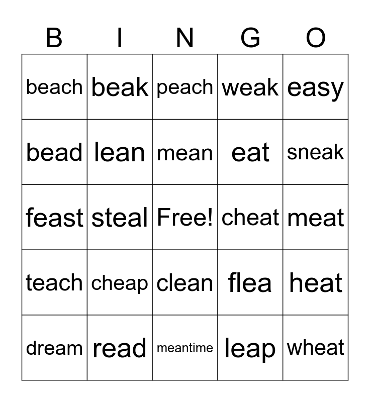 This bingo card has a free space and 24 words: cheap, read, mean, dream, easy, beach, bead, beak, cheat, clean, eat, feast, flea, heat, lean, leap, meat, peach, sneak, steal, wheat, teach, weak and meantime.