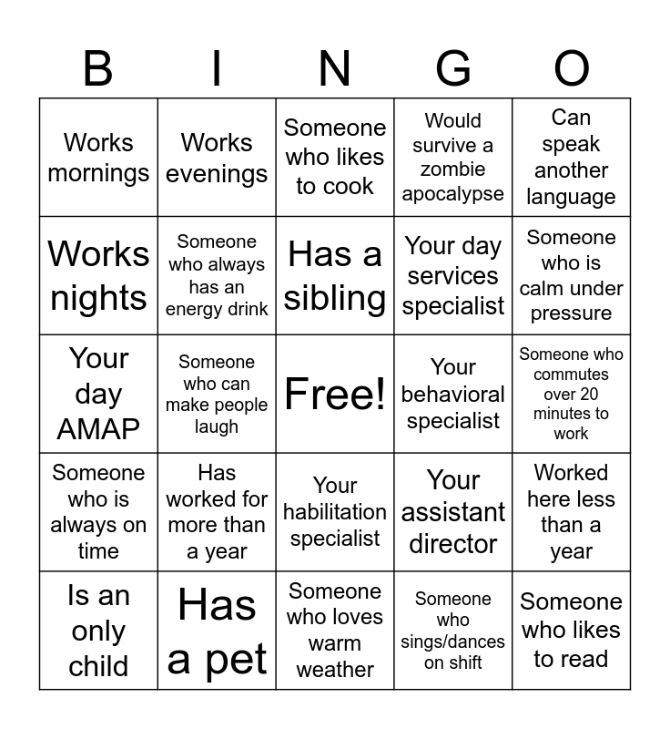 This bingo card has a free space and 24 words: Has worked for more than a year, Has a pet, Has a sibling, Is an only child, Can speak another language, Works mornings, Works nights, Works evenings, Your behavioral specialist, Your habilitation specialist, Your day services specialist, Your day AMAP, Your assistant director, Worked here less than a year, Someone who always has an energy drink, Someone who sings/dances on shift, Someone who commutes over 20 minutes to work, Someone who likes to cook, Someone who is calm under pressure, Someone who can make people laugh, Someone who likes to read, Someone who is always on time, Would survive a zombie apocalypse and Someone who loves warm weather.