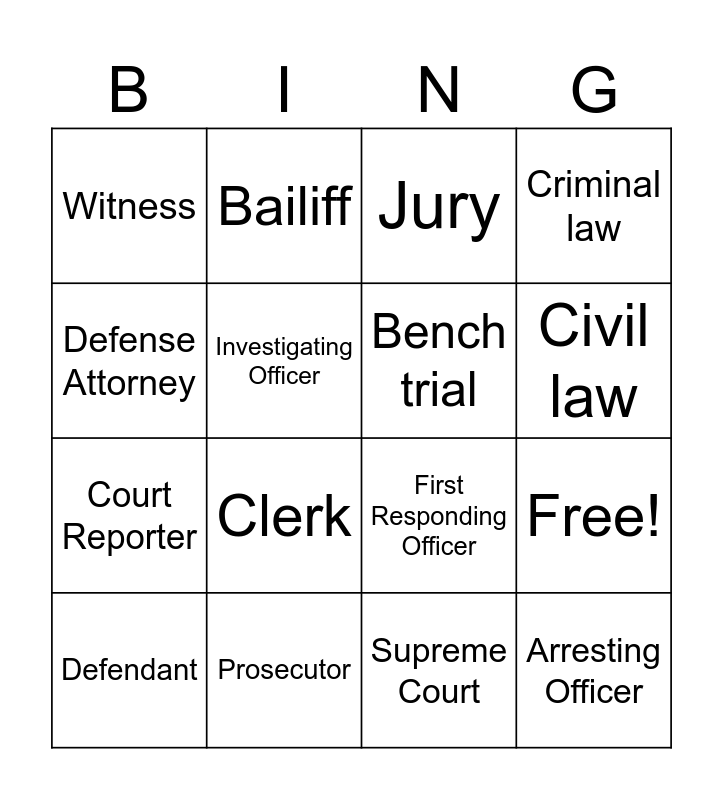 This bingo card has 20 words: Free!, Judge, Jury, Plaintiff, Defendant, Defense Attorney, Prosecutor, Witness, Court Reporter, Bailiff, Clerk, First Responding Officer, Investigating Officer, Arresting Officer, Bench trial, Sheriff deputy, Civil law, Criminal law, Supreme Court and Verdict.