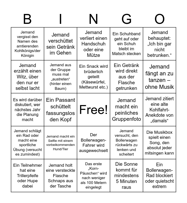 This bingo card has a free space and 50 words: Jemand verliert sein Schnapsglas (oder es reißt ab), Ein Bollerwagen-Rad blockiert oder quietscht extrem, Jemand fängt an, lautstark ein Lied zu singen (alle müssen einstimmen), Das erste „Korn-Päuschen“ wird nach weniger als 100 Metern eingelegt, Jemand macht ein Selfie mit einem vorbeikommenden Hund/Tier, Ein „Fremder“ wird gegrüßt und muss mitsaufen, Jemand verschüttet sein Getränk im Gehen, Ein anderes Kohlfahrt-Team wird gesichtet und lautstark begrüßt, Jemand erzählt einen Witz, über den nur er selbst lacht, Der Bollerwagen muss über ein Hindernis gehoben werden, Jemand aus der Gruppe muss mal „austreten“ (hinter einen Baum), Ein Schuhband geht auf oder ein Schuh bleibt im Matsch stecken, Die Musikbox spielt einen Song, den absolut jeder mitsingen kann, Jemand versucht, den Bollerwagen rückwärts zu lenken und scheitert, Das Wort „Grünkohl“ fällt mehr als 5-mal in einem Satz, Jemand trägt eine Kopfbedeckung, die nicht zum Wetter passt, Ein Snack wird brüderlich geteilt (Käsewürfel, Mettwurst etc.), Jemand macht ein peinliches Gruppenfoto, Die Playlist wird wegen „schlechter Musik“ kritisiert, Jemand behauptet: „Ich bin gar nicht betrunken.“, Ein Passant schüttelt fassungslos den Kopf, Die Sonne kommt für mindestens 5 Minuten raus, Jemand vergisst den Namen des amtierenden Kohlkönigs/der Königin, Ein Getränk wird direkt aus der Flasche getrunken, Jemand macht einen „Flachwitz“, der eigentlich zu schlecht ist, Die Truppe muss für ein anderes Fahrzeug Platz machen, Jemand fängt an zu tanzen – ohne Musik, Es wird über das Essen spekuliert („Hoffentlich ist die Pinkel gut“), Jemand verliert einen Handschuh oder eine Mütze, Der Bollerwagen-Fahrer wird ausgewechselt, Jemand macht ein Video für seine Story/WhatsApp-Status, Ein Becher wird am Boden gefunden (und entsorgt), Jemand hat „Ganzkörper-Schlagseite“ beim Gehen, Die Gruppe macht kollektiv ein „Prost“-Geräusch, Jemand holt eine versteckte Flasche Schnaps aus der Tasche, Ein Hund läuft durch die Gruppe, Jemand beschwert sich über kalte Füße oder Hände, Jemand muss angeschoben oder gestützt werden, Es wird ein Trinkspiel spontan erfunden, Jemand zitiert eine alte Kohlfahrt-Anekdote von „damals“, Ein Bollerwagen-Insasse (Kühltasche/Flasche) fällt fast raus, Jemand bietet dir einen Schnaps an, den du eigentlich nicht magst, Die Gruppe verläuft sich kurzzeitig oder nimmt einen Umweg, Jemand macht ein Foto von seinem leeren Schnapsglas, Ein Teilnehmer hat eine Trillerpfeife oder Hupe dabei, Es wird darüber diskutiert, wer nächstes Jahr die Planung macht, Jemand hat noch Reste vom Frühstück im Gesicht/an der Jacke, Ein Bollerwagen-Rad verliert eine Schraube oder Kappe, Jemand schlägt ein Rad oder macht eine sportliche Übung (versucht es zumindest) and Die gesamte Gruppe bleibt stehen, weil jemand ein „wichtiges Telefonat“ führt.