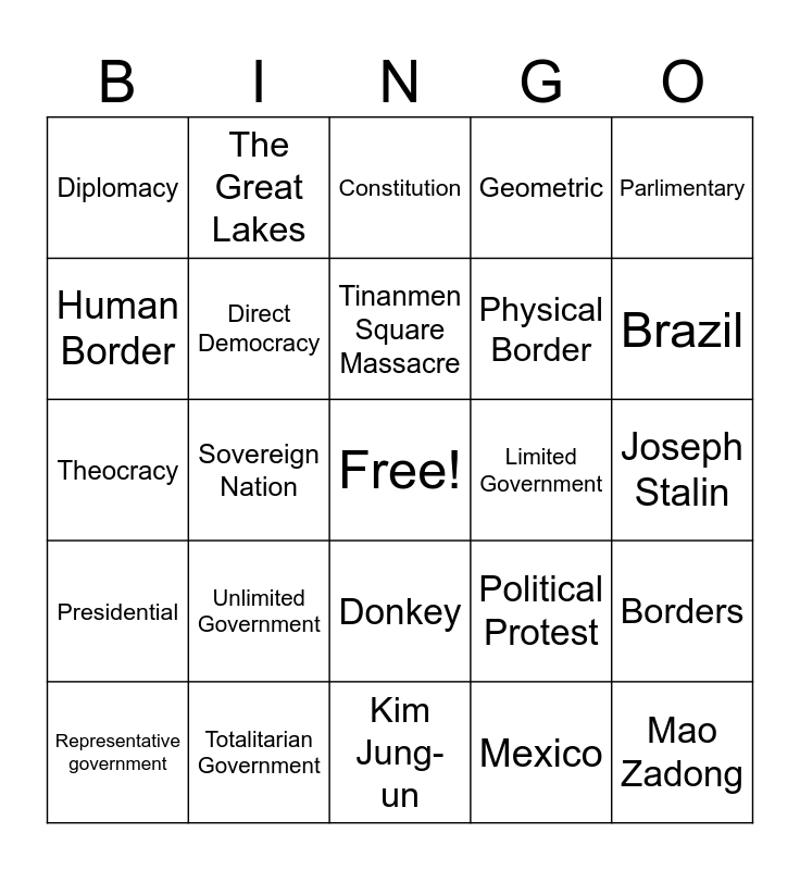 This bingo card has a free space and 29 words: Representative government, Public Opinion, Sovereign Nation, Foreign Policy, Diplomacy, Constitution, Direct Democracy, Unlimited Government, Limited Government, Totalitarian Government, Joseph Stalin, Mao Zadong, Kim Jung-un, Mexico, Brazil, Elephant, Donkey, Presidential, Parlimentary, Theocracy, Political Protest, Draft, Physical Border, Human Border, Geometric, The Great Lakes, Borders, Tinanmen Square Massacre and Paying Taxes.