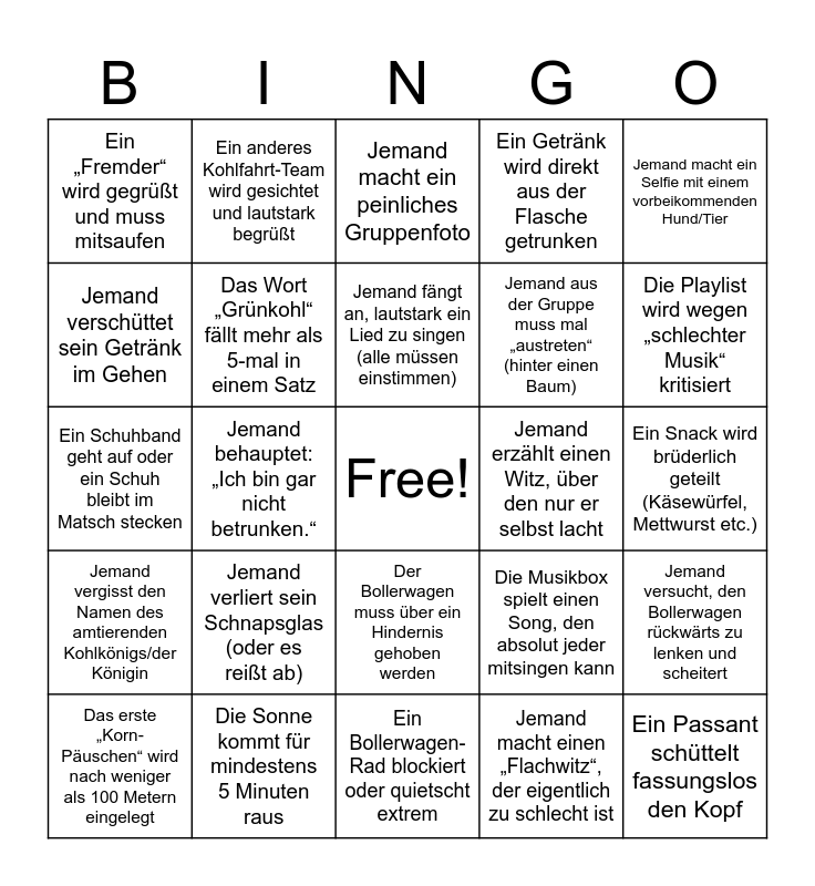 This bingo card has a free space and 25 words: Jemand verliert sein Schnapsglas (oder es reißt ab), Ein Bollerwagen-Rad blockiert oder quietscht extrem, Jemand fängt an, lautstark ein Lied zu singen (alle müssen einstimmen), Das erste „Korn-Päuschen“ wird nach weniger als 100 Metern eingelegt, Jemand macht ein Selfie mit einem vorbeikommenden Hund/Tier, Ein „Fremder“ wird gegrüßt und muss mitsaufen, Jemand verschüttet sein Getränk im Gehen, Ein anderes Kohlfahrt-Team wird gesichtet und lautstark begrüßt, Jemand erzählt einen Witz, über den nur er selbst lacht, Der Bollerwagen muss über ein Hindernis gehoben werden, Jemand aus der Gruppe muss mal „austreten“ (hinter einen Baum), Ein Schuhband geht auf oder ein Schuh bleibt im Matsch stecken, Die Musikbox spielt einen Song, den absolut jeder mitsingen kann, Jemand versucht, den Bollerwagen rückwärts zu lenken und scheitert, Das Wort „Grünkohl“ fällt mehr als 5-mal in einem Satz, Jemand trägt eine Kopfbedeckung, die nicht zum Wetter passt, Ein Snack wird brüderlich geteilt (Käsewürfel, Mettwurst etc.), Jemand macht ein peinliches Gruppenfoto, Die Playlist wird wegen „schlechter Musik“ kritisiert, Jemand behauptet: „Ich bin gar nicht betrunken.“, Ein Passant schüttelt fassungslos den Kopf, Die Sonne kommt für mindestens 5 Minuten raus, Jemand vergisst den Namen des amtierenden Kohlkönigs/der Königin, Ein Getränk wird direkt aus der Flasche getrunken and Jemand macht einen „Flachwitz“, der eigentlich zu schlecht ist.