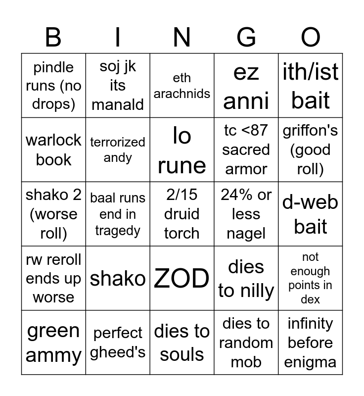 This bingo card has 25 words: shako, dies to souls, lo rune, green ammy, ith/ist bait, pindle runs (no drops), warlock book, soj jk its manald, 24% or less nagel, ZOD, tc <87 sacred armor, shako 2 (worse roll), dies to nilly, not enough points in dex, terrorized andy, infinity before enigma, d-web bait, eth arachnids, griffon's (good roll), baal runs end in tragedy, 2/15 druid torch, perfect gheed's, rw reroll ends up worse, ez anni and dies to random mob.