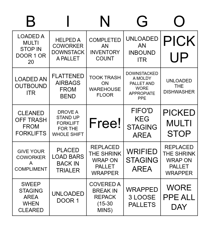 This bingo card has a free space and 24 words: PLACED LOAD BARS BACK IN TRIALER, UNLOADED DOOR 1, TOOK TRASH ON WAREHOUSE FLOOR, SWEEP STAGING AREA WHEN CLEARED, PICK UP, LOADED A MULTI STOP IN DOOR 1 OR 20, LOADED AN OUTBOUND ITR, HELPED A COWORKER DOWNSTACK A PALLET, FIFO'D KEG STAGING AREA, REPLACED THE SHRINK WRAP ON PALLET WRAPPER, DOWNSTACKED A MOLDY PALLET AND WORE APPROPIATE PPE, CLEANED OFF TRASH FROM FORKLIFTS, WRIFIED STAGING AREA, REPLACED THE SHRINK WRAP ON PALLET WRAPPER, FLATTENED AIRBAGS FROM BEND, WRAPPED 3 LOOSE PALLETS, PICKED MULTI STOP, COMPLETED AN INVENTORY COUNT, UNLOADED THE DISHWASHER, DROVE A STAND UP FORKLIFT FOR THE WHOLE SHIFT, WORE PPE ALL DAY, GIVE YOUR COWORKER A COMPLIMENT, UNLOADED AN INBOUND ITR and COVERED A BREAK IN REPACK (15-30 MINS).