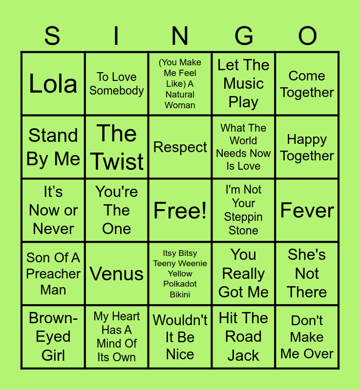 This bingo card has a free space and 40 words: He'll Have To Go, It’s Now or Never, Handy Man, The Twist, My Heart Has A Mind Of Its Own, Itsy Bitsy Teeny Weenie Yellow Polkadot Bikini, Respect, Rescue Me, Come Together, Son Of A Preacher Man, You're The One, Let The Music Play, Don't Make Me Over, Fever, I'm Not Your Steppin Stone, Venus, Be My Baby, Lola, Here Comes My Baby, (You Make Me Feel Like) A Natural Woman, She's Not There, Hit The Road Jack, What The World Needs Now Is Love, Stand By Me, Mrs. Robinson, Build Me Up Buttercup, Sunny Afternoon, Suspicious Minds, These Boots Are Made For Walking, Light My Fire, I'm A Believer, Brown-Eyed Girl, Twist And Shout, You Really Got Me, Happy Together, Wouldn't It Be Nice, Unchained Melody, Oh, Pretty Woman, To Love Somebody and My Girl.