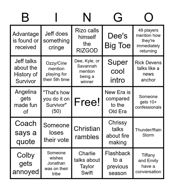 This bingo card has a free space and 34 words: Jenna mentions playing on Season 1, Flashback to a previous season, Players mention targeting Q, Mike mentions White Lotus, Coach says a quote, Ozzy/Cirie mention playing for their 5th time, 49 players mention how they're immediately returning, Colby gets annoyed, Jeff does something cringe, Celebrity BS, Dee, Kyle, or Savannah mention being a winner, Rizo calls himself the RIZGOD, Fan vote is highlighted, More than one player goes home, New Era is compared to the Old Era, Rick Devens talks like a news anchor, Someone wishes Jonathan was on their tribe, Angelina gets made fun of, Someone loses their vote, Chrissy talks about fire making, Christian rambles, Players get muddy, Advantage is found or received, Someone gets 10+ confessionals, Charlie talks about Taylor Swift, Tiffany and Emily have a conversation, Dee's Big Toe, SiTD played, Super cool intro, Jeff talks about the History of Survivor, "You gotta DIG DEEP", "That's how you do it on Survivor"(50), Thunder/Rain Storm and Someone gets Injured.