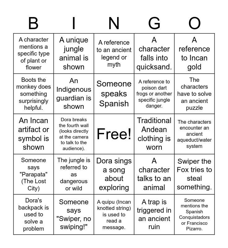 This bingo card has a free space and 34 words: Someone speaks Quechua, A trap is triggered in an ancient ruin, The word "Inca" is mentioned, A wide shot of the Amazon Rainforest canopy, Someone says "Parapata" (The Lost City), An Indigenous guardian is shown, A reference to Incan gold, Dora's backpack is used to solve a problem, A unique jungle animal is shown, A map or stars are used to navigate, Someone speaks Spanish, A reference to an ancient legend or myth, The group encounters a jungle hazard (quicksand, spores), Mention of an Incan god or the Sun (Inti), Traditional Andean clothing is worn, The characters have to solve an ancient puzzle, Someone says "Swiper, no swiping!", An Incan artifact or symbol is shown, The jungle is referred to as dangerous or wild, A character talks to an animal, Dora sings a song about exploring, Someone mentions "exploring" vs. "treasure hunting", A character mentions a specific type of plant or flower, The characters encounter an ancient aqueduct/water system, A quipu (Incan knotted string) is used to read a message., Someone mentions the Spanish Conquistadors or Francisco Pizarro., A character falls into quicksand., The characters hallucinate and turn into 2D cartoons, A reference to poison dart frogs or another specific jungle danger., Boots the monkey does something surprisingly helpful., An ancient puzzle involving water or plumbing is solved., Dora breaks the fourth wall (looks directly at the camera to talk to the audience)., Swiper the Fox tries to steal something. and Someone sings or dances to the "We Did It!" (¡Lo hicimos!) song..