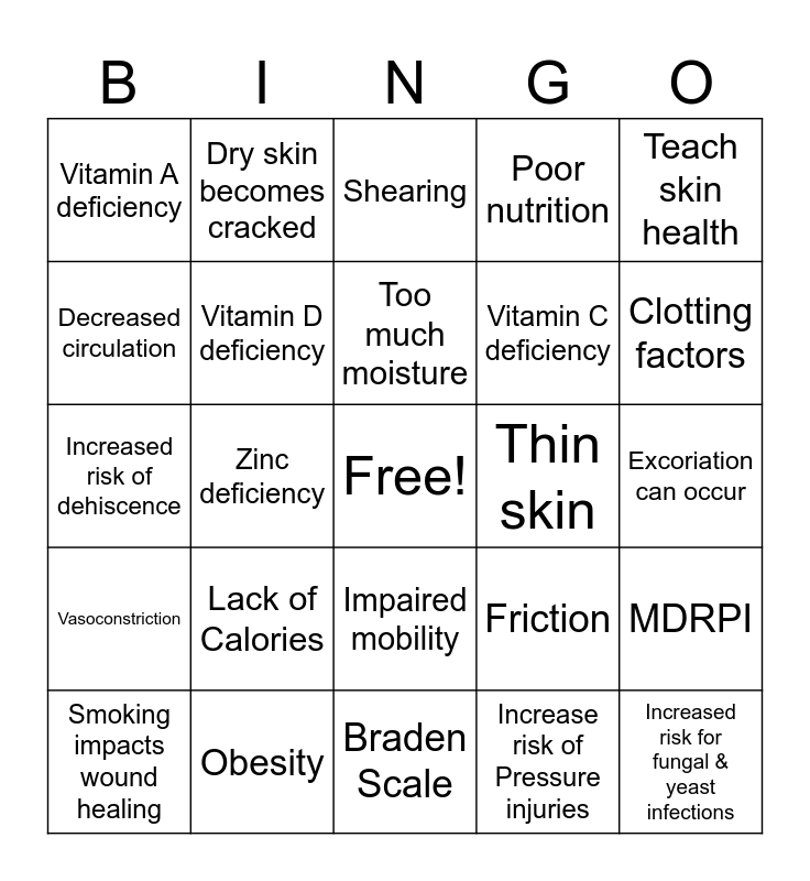 This bingo card has a free space and 24 words: Lack of Calories, Obesity, Too much moisture, Smoking impacts wound healing, Teach skin health, Vitamin A deficiency, Decreased circulation, Dry skin becomes cracked, Thin skin, Impaired mobility, Vitamin C deficiency, Increased risk of dehiscence, Friction, MDRPI, Vitamin D deficiency, Increase risk of Pressure injuries, Excoriation can occur, Shearing, Clotting factors, Zinc deficiency, Increased risk for fungal & yeast infections, Vasoconstriction, Poor nutrition and Braden Scale.