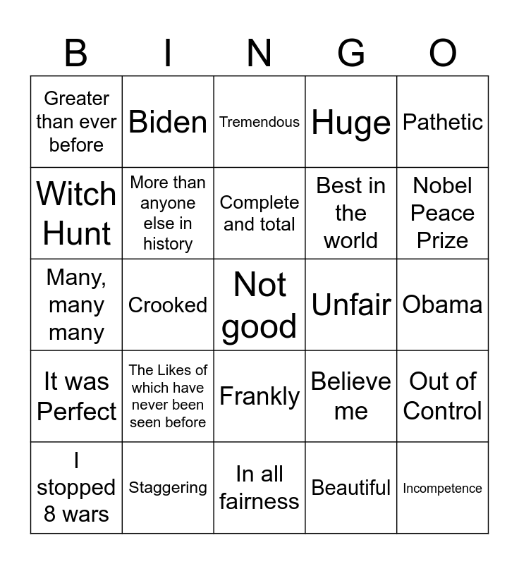 This bingo card has 25 words: The Likes of which have never been seen before, In all fairness, Complete and total, I stopped 8 wars, Pathetic, Greater than ever before, Witch Hunt, Biden, Unfair, Frankly, Best in the world, Many, many many, Believe me, Out of Control, More than anyone else in history, Incompetence, Obama, Tremendous, Nobel Peace Prize, Crooked, Not good, Staggering, It was Perfect, Huge and Beautiful.
