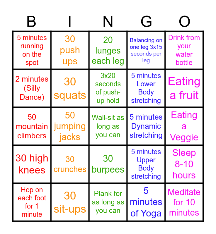 This bingo card has 25 words: 30 high knees, 30 sit-ups, Wall-sit as long as you can, 5 minutes of Yoga, Drink from your water bottle, 5 minutes running on the spot, 30 push ups, 20 lunges each leg, 5 minutes Dynamic stretching, Sleep 8-10 hours, 2 minutes (Silly Dance), 30 squats, Plank for as long as you can, 5 minutes Upper Body stretching, Eating a fruit, Hop on each foot for 1 minute, 50 jumping jacks, 3x20 seconds of push-up hold, 5 minutes Lower Body stretching, Eating a Veggie, 50 mountain climbers, 30 crunches, 30 burpees, Balancing on one leg 3x15 seconds per leg and Meditate for 10 minutes.