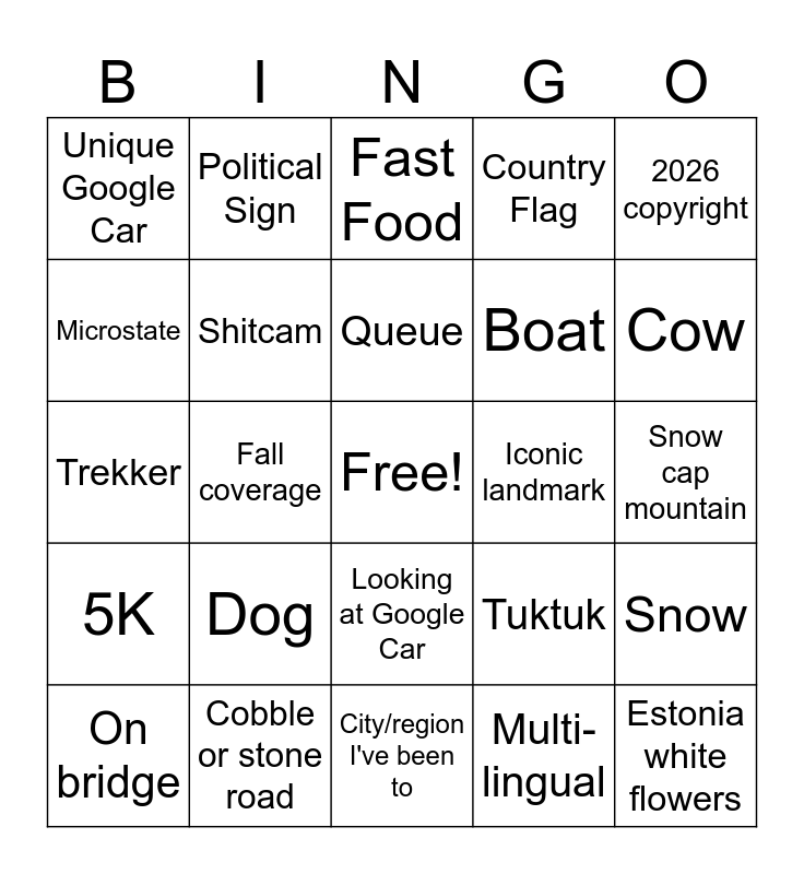 This bingo card has a free space and 24 words: Dog, Cobble or stone road, Queue, On bridge, 2026 copyright, Unique Google Car, Microstate, Political Sign, Iconic landmark, Looking at Google Car, Boat, Trekker, Tuktuk, Snow, Shitcam, Multi-lingual, Snow cap mountain, Fast Food, Cow, Fall coverage, Estonia white flowers, 5K, Country Flag and City/region I've been to.