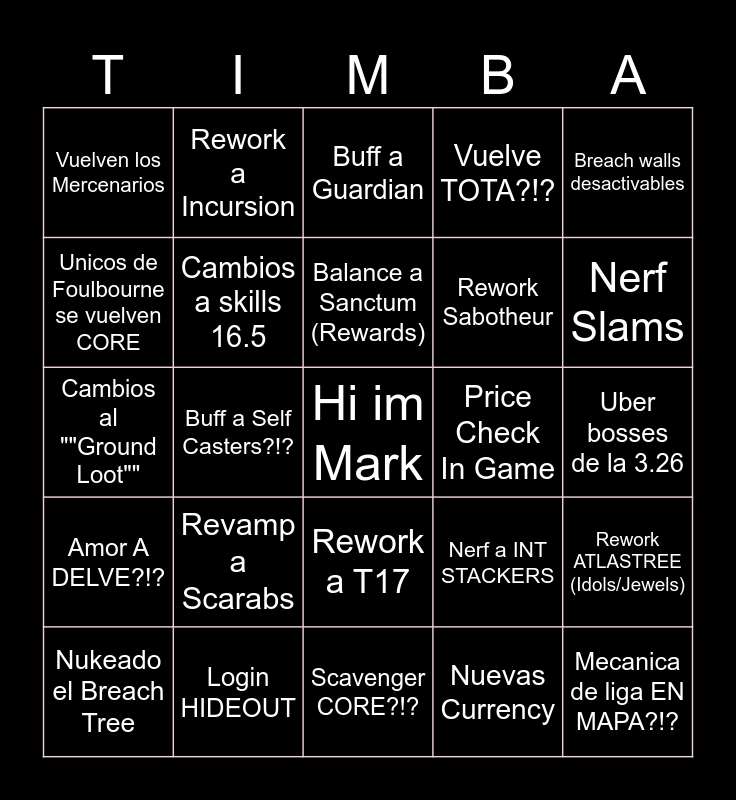 This bingo card has a free space and 24 words: Revamp a Scarabs, Login HIDEOUT, Balance a Sanctum (Rewards), Nukeado el Breach Tree, Breach walls desactivables, Vuelven los Mercenarios, Unicos de Foulbourne se vuelven CORE, Rework a Incursion, Price Check In Game, Rework a T17, Rework Sabotheur, Cambios al ""Ground Loot"", Nerf a INT STACKERS, Rework ATLASTREE (Idols/Jewels), Cambios a skills 16.5, Nuevas Currency, Uber bosses de la 3.26, Buff a Guardian, Nerf Slams, Buff a Self Casters?!?, Mecanica de liga EN MAPA?!?, Amor A DELVE?!?, Vuelve TOTA?!? and Scavenger CORE?!?.