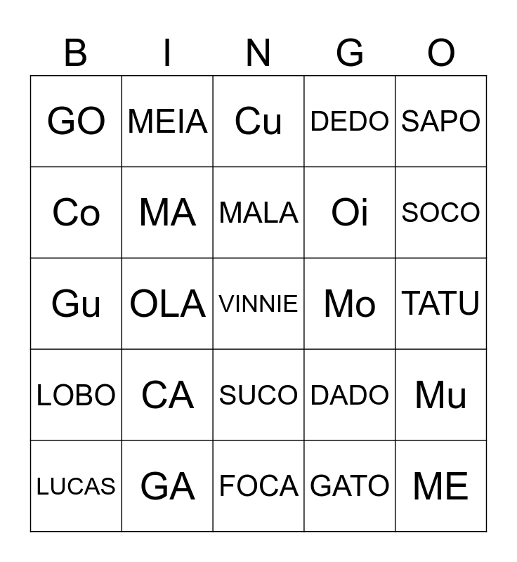 This bingo card has a free space and 24 words: CA, GA, MALA, LUCAS, SAPO, GO, Co, MEIA, Mo, SUCO, Oi, Gu, DADO, Mu, MA, GATO, TATU, Cu, SOCO, OLA, ME, LOBO, DEDO and FOCA.