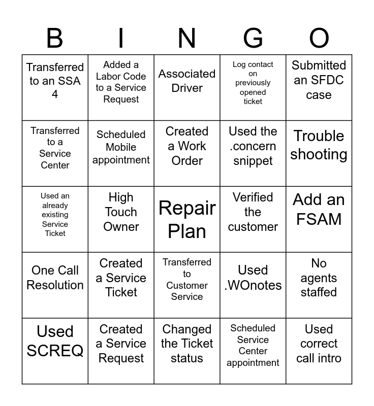 This bingo card has a free space and 24 words: Created a Service Ticket, Created a Service Request, Created a Work Order, Used SCREQ, Submitted an SFDC case, Transferred to an SSA 4, Transferred to a Service Center, Added a Labor Code to a Service Request, Verified the customer, Transferred to Customer Service, Used the .concern snippet, Used an already existing Service Ticket, Used .WOnotes, No agents staffed, Scheduled Mobile appointment, Scheduled Service Center appointment, Add an FSAM, Associated Driver, Trouble shooting, High Touch Owner, Used correct call intro, One Call Resolution, Log contact on previously opened ticket and Changed the Ticket status.
