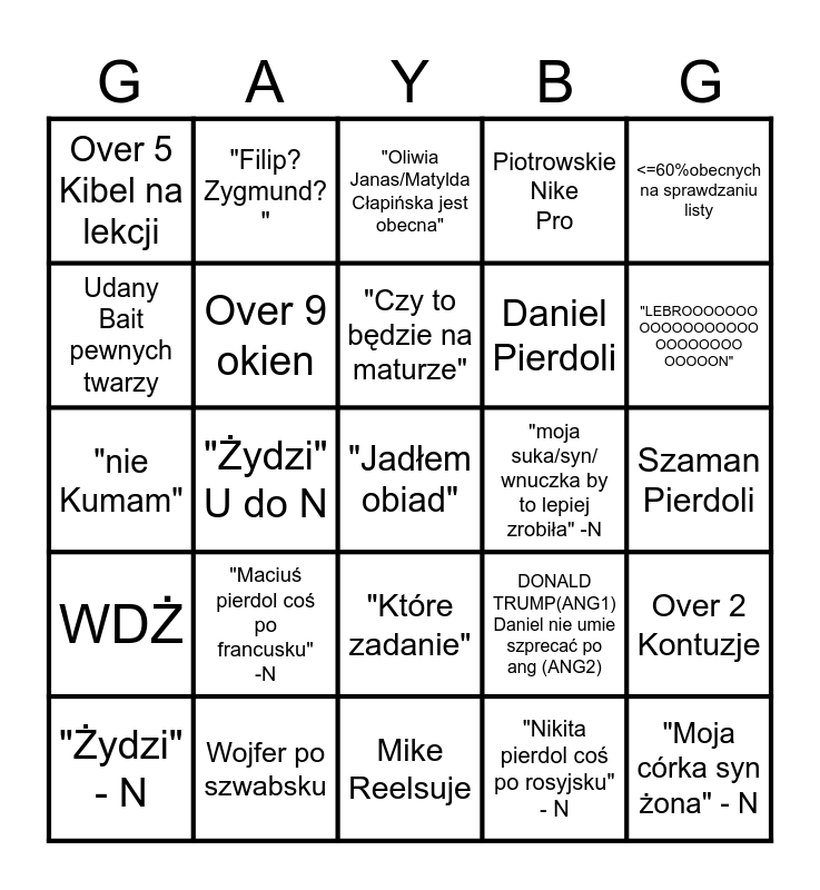 This bingo card has 25 words: "Maciuś pierdol coś po francusku" -N, Mike Reelsuje, "Czy to będzie na maturze", "Żydzi" - N, <=60%obecnych na sprawdzaniu listy, Over 5 Kibel na lekcji, Udany Bait pewnych twarzy, "Filip? Zygmund? ", "moja suka/syn/ wnuczka by to lepiej zrobiła" -N, "Które zadanie", Daniel Pierdoli, "nie Kumam", DONALD TRUMP(ANG1) Daniel nie umie szprecać po ang (ANG2), Over 2 Kontuzje, Over 9 okien, "Moja córka syn żona" - N, Szaman Pierdoli, "Oliwia Janas/Matylda Cłapińska jest obecna", "LEBROOOOOOO OOOOOOOOOOO OOOOOOOO OOOOON", "Żydzi" U do N, "Jadłem obiad", Wojfer po szwabsku, WDŻ, Piotrowskie Nike Pro and "Nikita pierdol coś po rosyjsku" - N.