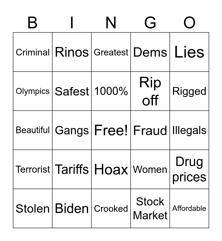 This bingo card has a free space and 24 words: Tariffs, Biden, 1000%, Stolen, Lies, Criminal, Olympics, Rinos, Fraud, Hoax, Rip off, Beautiful, Women, Drug prices, Safest, Stock Market, Illegals, Greatest, Rigged, Gangs, Affordable, Terrorist, Dems and Crooked.
