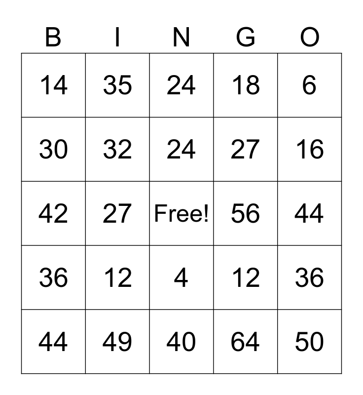 This bingo card has a free space and 24 words: 12, 49, 24, 44, 6, 14, 30, 35, 56, 4, 27, 42, 12, 36, 32, 64, 44, 24, 16, 27, 50, 36, 18 and 40.