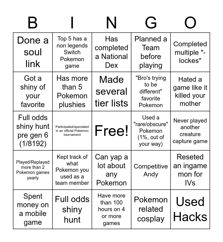 This bingo card has a free space and 24 words: Kept track of what Pokemon you used as a team member, Full odds shiny hunt, Made several tier lists, Spent money on a mobile game, Completed multiple "-lockes", Done a soul link, Got a shiny of your favorite, Top 5 has a non legends Switch Pokemon game, Used a "rare/obscure" Pokemon (1%, out of your way), Can yap a lot about any Pokemon, "Bro's trying to be different" favorite Pokemon, Full odds shiny hunt pre gen 6 (1/8192), Competitive Andy, Reseted an ingame mon for IVs, Has more than 5 Pokemon plushies, Pokemon related cosplay, Never played another creature capture game, Has completed a National Dex, Hated a game like it killed your mother, Participated/spectated in an official Pokemon tournament, Used Hacks, Played/Replayed more than 2 Pokemon games yearly, Planned a Team before playing and Have more than 100 hours on 4 or more games.