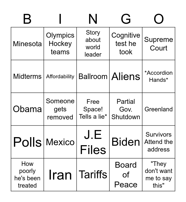 This bingo card has a free space and 24 words: Mexico, Iran, Ballroom, How poorly he's been treated, Supreme Court, Minesota, Midterms, Olympics Hockey teams, Partial Gov. Shutdown, J.E Files, Aliens, Obama, Biden, Survivors Attend the address, Affordability, Board of Peace, Greenland, Story about world leader, *Accordion Hands*, Someone gets removed, "They don't want me to say this", Polls, Cognitive test he took and Tariffs.