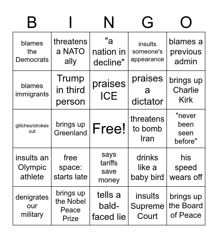 This bingo card has a free space and 25 words: free space: starts late, tells a bald-faced lie, praises ICE, denigrates our military, blames a previous admin, blames the Democrats, blames immigrants, threatens a NATO ally, threatens to bomb Iran, says tariffs save money, praises a dictator, glitches/strokes out, drinks like a baby bird, his speed wears off, Trump in third person, "bigly", "never been seen before", "a nation in decline", brings up Charlie Kirk, brings up Greenland, brings up the Board of Peace, brings up the Nobel Peace Prize, insults an Olympic athlete, insults someone's appearance and insults Supreme Court.