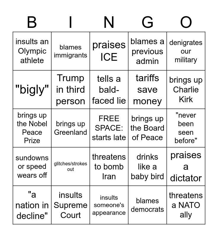 This bingo card has a free space and 24 words: glitches/strokes out, insults Supreme Court, tells a bald-faced lie, "a nation in decline", denigrates our military, insults an Olympic athlete, "bigly", blames immigrants, brings up the Board of Peace, threatens to bomb Iran, tariffs save money, brings up the Nobel Peace Prize, drinks like a baby bird, praises a dictator, Trump in third person, blames democrats, "never been seen before", praises ICE, brings up Charlie Kirk, brings up Greenland, threatens a NATO ally, sundowns or speed wears off, blames a previous admin and insults someone's appearance.