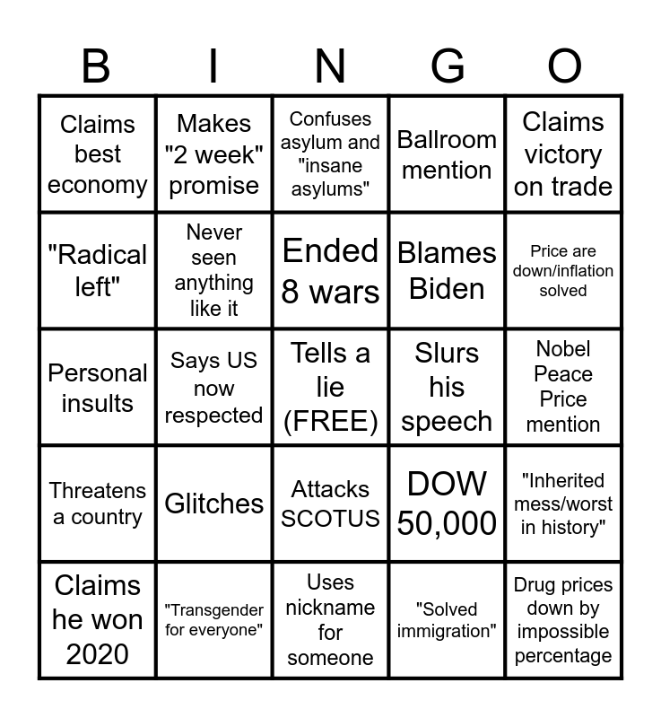 This bingo card has a free space and 24 words: Glitches, "Transgender for everyone", Ended 8 wars, Claims he won 2020, Claims victory on trade, Claims best economy, "Radical left", Makes "2 week" promise, Slurs his speech, Attacks SCOTUS, Blames Biden, Personal insults, DOW 50,000, "Inherited mess/worst in history", Never seen anything like it, "Solved immigration", Nobel Peace Price mention, Confuses asylum and "insane asylums", Price are down/inflation solved, Says US now respected, Drug prices down by impossible percentage, Threatens a country, Ballroom mention and Uses nickname for someone.