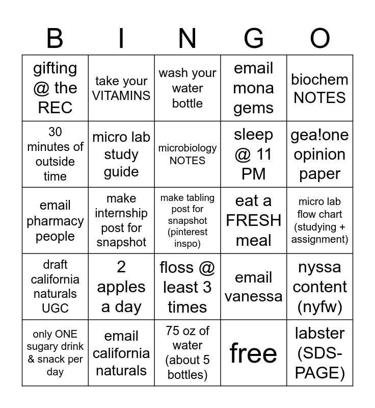 This bingo card has 25 words: 2 apples a day, 75 oz of water (about 5 bottles), microbiology NOTES, only ONE sugary drink & snack per day, biochem NOTES, gifting @ the REC, 30 minutes of outside time, take your VITAMINS, eat a FRESH meal, floss @ least 3 times, sleep @ 11 PM, email pharmacy people, email vanessa, nyssa content (nyfw), micro lab study guide, labster (SDS-PAGE), micro lab flow chart (studying + assignment), wash your water bottle, gea!one opinion paper, make internship post for snapshot, make tabling post for snapshot (pinterest inspo), email california naturals, draft california naturals UGC, email mona gems and free.