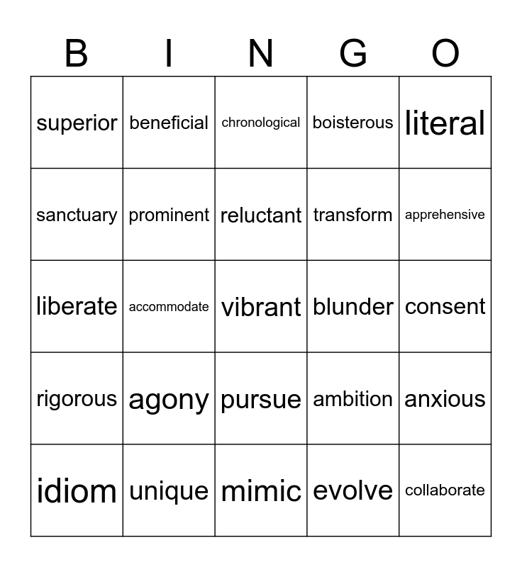 This bingo card has 25 words: rigorous, unique, vibrant, evolve, literal, superior, beneficial, chronological, blunder, anxious, sanctuary, prominent, mimic, ambition, apprehensive, idiom, accommodate, reluctant, transform, consent, liberate, agony, pursue, boisterous and collaborate.