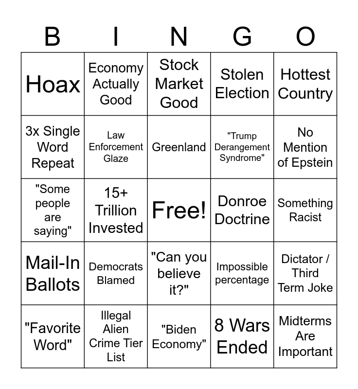 This bingo card has a free space and 25 words: Democrats Blamed, "Biden Economy", Greenland, "Favorite Word", Hottest Country, Hoax, 3x Single Word Repeat, Economy Actually Good, Donroe Doctrine, "Can you believe it?", "Trump Derangement Syndrome", "Some people are saying", Impossible percentage, Dictator / Third Term Joke, Law Enforcement Glaze, Christian Pandering, Something Racist, Stock Market Good, No Mention of Epstein, 15+ Trillion Invested, Midterms Are Important, Illegal Alien Crime Tier List, Mail-In Ballots, Stolen Election and 8 Wars Ended.