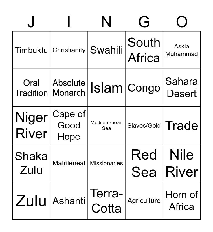 This bingo card has a free space and 24 words: Matrileneal, Ashanti, Islam, Zulu, Askia Muhammad, Timbuktu, Oral Tradition, Christianity, Slaves/Gold, Missionaries, Congo, Niger River, Red Sea, Nile River, Absolute Monarch, Agriculture, Trade, Swahili, Sahara Desert, Cape of Good Hope, Horn of Africa, Shaka Zulu, South Africa and Terra-Cotta.