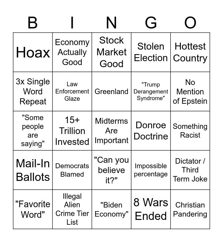 This bingo card has 25 words: Democrats Blamed, "Biden Economy", Greenland, "Favorite Word", Hottest Country, Hoax, 3x Single Word Repeat, Economy Actually Good, Donroe Doctrine, "Can you believe it?", "Trump Derangement Syndrome", "Some people are saying", Impossible percentage, Dictator / Third Term Joke, Law Enforcement Glaze, Christian Pandering, Something Racist, Stock Market Good, No Mention of Epstein, 15+ Trillion Invested, Midterms Are Important, Illegal Alien Crime Tier List, Mail-In Ballots, Stolen Election and 8 Wars Ended.