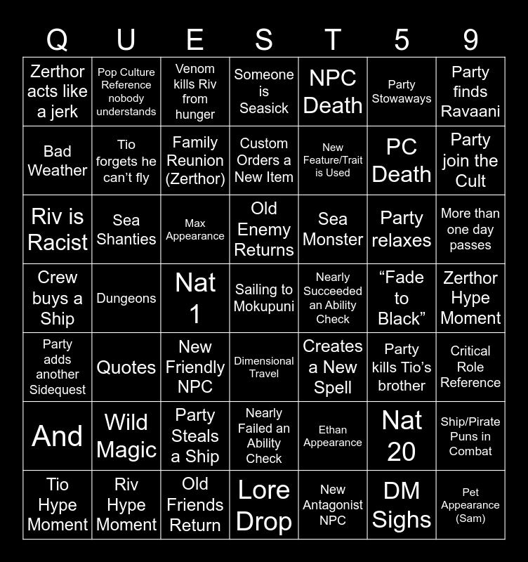 This bingo card has a free space and 59 words: Time Shenanigans, Crew buys a Ship, Pirates, Sea Shanties, Nat 1, Nat 20, Party finds Ravaani, Technical Difficulties, Tio forgets he can’t fly, Ship/Pirate Puns in Combat, Someone is Seasick, Party Steals a Ship, Party Stowaways, New Friendly NPC, New Antagonist NPC, Zerthor acts like a jerk, PC Death, NPC Death, Imposter on a Pirate Ship, Bad Weather, Party join the Cult, Venom kills Riv from hunger, More than one day passes, Party relaxes, Shopping, Dimensional Travel, Party adds another Sidequest, Family Reunion (Tio), Family Reunion (Zerthor), Party kills Tio’s brother, Party finds the Shard, Wild Magic, Lore Drop, DM Sighs, Pop Culture Reference nobody understands, Nearly Succeeded an Ability Check, Nearly Failed an Ability Check, New Feature/Trait is Used, Creates a New Spell, Custom Orders a New Item, Ethan Appearance, Max Appearance, Riv is Racist, Nev Hype Moment, Zerthor Hype Moment, Tio Hype Moment, Riv Hype Moment, Old Friends Return, Old Enemy Returns, Dungeons, Dragons, And, “Fade to Black”, Quotes, Critical Role Reference, Sea Monster, Pet Appearance (Kat), Pet Appearance (Sam) and Pet Appearance (Kelsey).