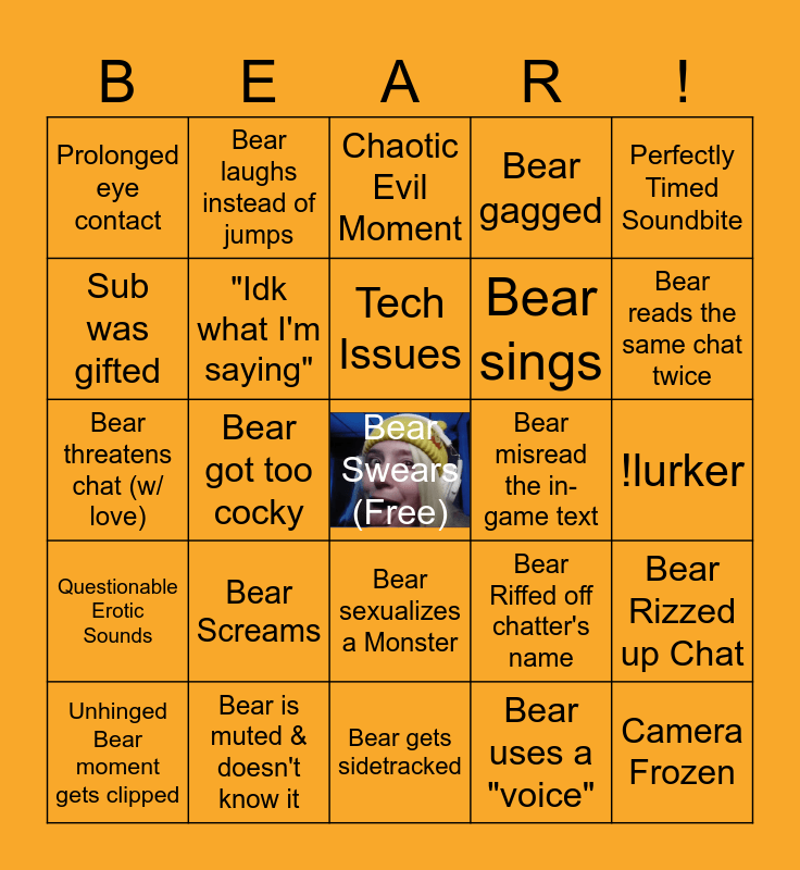 This bingo card has a free space and 49 words: Bear Jumps, Camera Frozen, Be Gone, Bot!, Bear gets sidetracked, Bear Screams, Bear says another pun, Bear laughs instead of jumps, New Chatter, Sub was gifted, New Cub, "Idk what I'm saying", Bear gagged, Bear Rizzed up Chat, Bear Riffed off chatter's name, Bear uncomfortably laughed, Bear vogued, Tech Issues, Bear misread the in-game text, "Oh my lanta", Perfectly Timed Soundbite, Bear got too cocky, Bear uses a "voice", Prolonged eye contact, Bear sings, "Clench those cheeks", Bear reads the same chat twice, Unhinged Bear moment gets clipped, Bear covers mouth when laughing, Bear sexualizes a Monster, Questionable Erotic Sounds, "When is it going to get scary?", Bad Freeze Frame gets posted on Discord, Bear Wishes water was "something else", Bear Scares a New Chatter, Bear is muted & doesn't know it, RIP Ears, Bear scared twice, Bear guesses jumpscare, !lurker, Cub's "Huh?", Pauses during gameplay, Stream Streak, Bear is lost, Bear threatens to quit the game, Bear threatens chat (w/ love), Chaotic Evil Moment, Bear Gaslights Chat, Someone enters chat during an out-of-context moment and Ratchet (my dog) Visits.