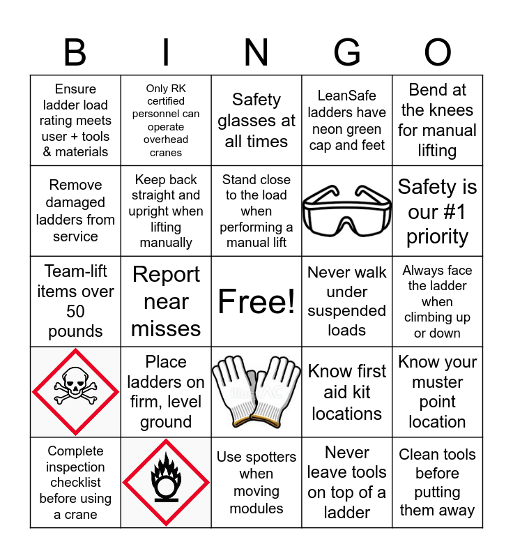 This bingo card has 18 images, a free space and 61 words: Wear required PPE, Bump cap or hard hat, Safety glasses at all times, Over the ankle work boots, Work gloves, 5S, Keep work areas clean, Practice good housekeeping, Sort Shine Set Standardize Sustain, Maintain 3 points of contact on a ladders and stairs, Always keep belt buckle within the frame of the ladder, Never walk a ladder, LeanSafe ladders have neon green cap and feet, Ensure ladder load rating meets user + tools & materials, Inspect ladders before each use, Remove damaged ladders from service, Ensure ladder rungs are clean and free of oil and grease, Place ladders on firm, level ground, Fully open and lock step ladders before use, Always face the ladder when climbing up or down, Do not stand on the top step or top cap of a step ladder, Bend at the knees for manual lifting, Team-lift items over 50 pounds, Stand close to the load when performing a manual lift, Keep back straight and upright when lifting manually, Tighten core muscles when lifting manually, Perform manual lifts smoothly - no jerking or twisting, No twisting when performing a manual lift - turn with your feet, Watch for pinch points position when lifting manually, Use your stop work authority, Safety is our #1 priority, Safety first, Use spotters when moving modules, Use spotters when moving awkward loads, Complete inspection checklist before using a crane, Never walk under suspended loads, Follow lockout / tagout procedures, Inspect tools before use, Use the correct tool for the task, Clean tools before putting them away, Maintain safe walking speed in production areas, Secure modules and equipment during lifting and rigging, Inspect rigging slings before use, Complete inspection checklist before using a crane, Only RK certified personnel can operate forklifts, Only RK certified personnel can operate overhead cranes, Only RK certified personnel can operate scissor lifts, Must be harnessed and tied off when in scissor lift, Must be tied off when working above 4 feet of elevation, Know your emergency exits, Know your muster point location, Report near misses, Know first aid kit locations, Know eyewash station locations, Know AED locations, Everyone goes home safe, All bottles and containers must be labeled, Always use a face shield when grinding / cutting, Never leave tools on top of a ladder, Never connect SRL lifelines to a module and Know your closest fire extinguisher.