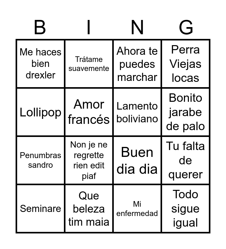This bingo card has 32 words: El monstruo de la laguna, Una flor de jacaranda, Mi enfermedad, 11 y 6 fito paez, Seminare, Amor francés, Ahora te puedes marchar, Luna de miel, Lollipop, Vasos Vacíos, Lamento boliviano, Perra Viejas locas, La rubia tarada, La bifurcada, Voy a bailar a la.mave del olvido, Blues local, Canción de bañar la luna, Non je ne regrette rien edit piaf, La vaca estudiosa, Todo sigue igual, Chipi chipi, 488 kilómetros, Sabor a mi luis miguel, El último trago j a jimenez, Penumbras sandro, Trátame suavemente, Buen dia dia, Bonito jarabe de palo, Me haces bien drexler, Que beleza tim maia, Paisaje gilda and Tu falta de querer.