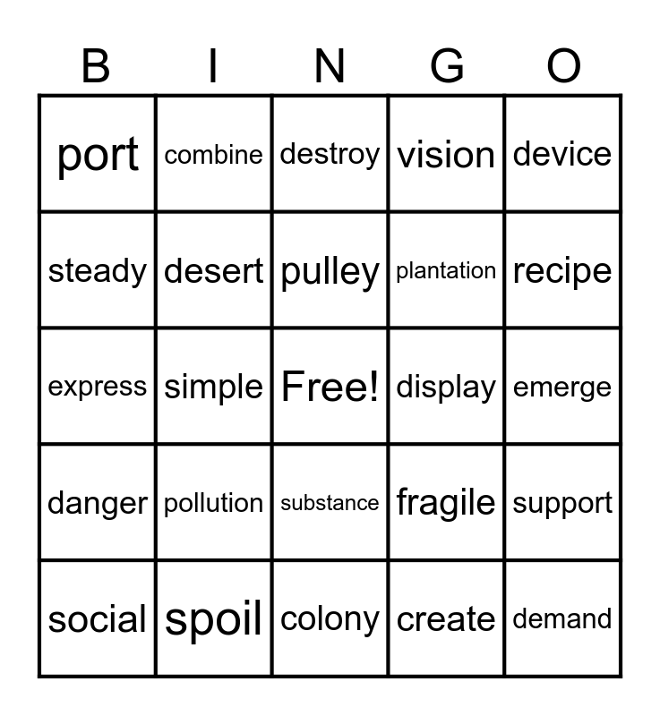 This bingo card has a free space and 24 words: pollution, spoil, pulley, social, device, port, steady, combine, display, substance, plantation, express, fragile, support, desert, create, emerge, destroy, recipe, simple, demand, danger, vision and colony.