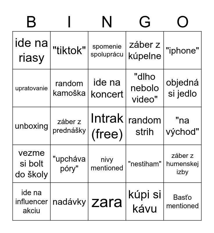 This bingo card has a free space and 30 words: nadávky, kino, záber z prednášky, ide na nechty, ide na riasy, spomenie spoluprácu, random kamoška, nivy mentioned, random strih, zara, "na východ", Basťo mentioned, kúpi si kávu, záber na ružový kávovar, objedná si jedlo, "protein", "nestiham", vezme si bolt do školy, "upcháva póry", "iphone", unboxing, varí, "tiktok", "dlho nebolo video", upratovanie, záber z kúpelne, záber z humenskej izby, ide na influencer akciu, ide na koncert and ide do prahy.