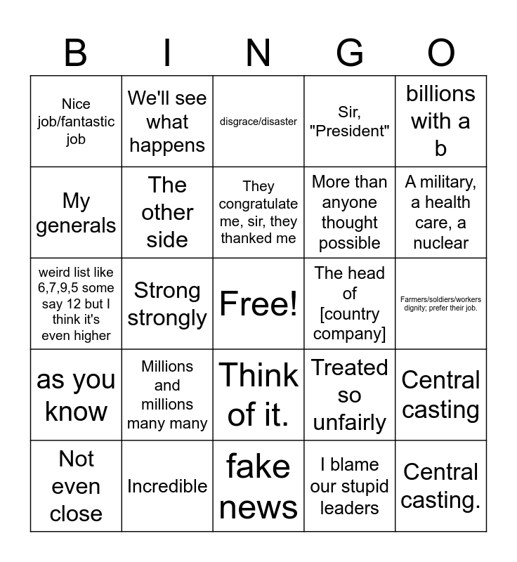 This bingo card has a free space and 30 words: Incredible, you take a look at, Strong strongly, More than anyone thought possible, Nice job/fantastic job, disgrace/disaster, The other side, Think of it., The head of [country company], fake news, Farmers/soldiers/workers dignity; prefer their job., Central casting., I blame our stupid leaders, Should have been solved a long time ago, A military, a health care, a nuclear, [what I just said] a big deal, so true, Treated so unfairly, as you know, Millions and millions many many, billions with a b, weird list like 6,7,9,5 some say 12 but I think it's even higher, The best equipment in the world not even close, We'll see what happens, More than anyone thought possible, My generals, Sir, "President", Central casting, Not even close, They congratulate me, sir, they thanked me and If precise, then couch, eg "I better say maybe or the dishonest press will say "Donald Trump has...".