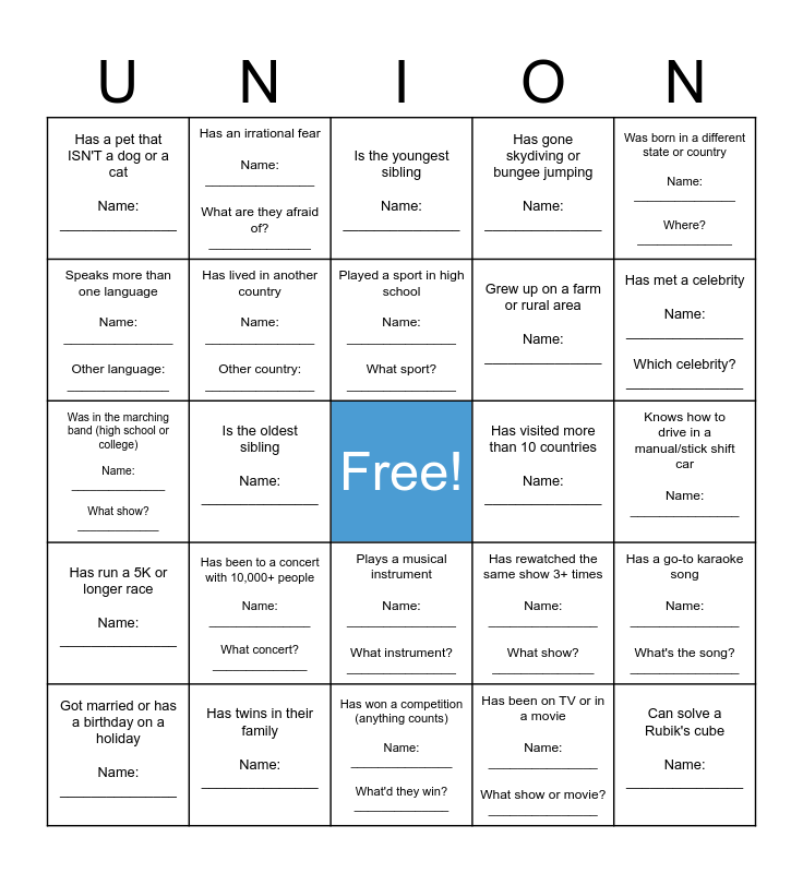 This bingo card has a free space and 24 words: Has been to a concert with 10,000+ people Name: _______________ What concert? ______________, Has twins in their family Name: _______________, Played a sport in high school Name: _______________ What sport? _______________, Got married or has a birthday on a holiday Name: _______________, Was born in a different state or country Name: _______________ Where? ______________, Has a pet that ISN'T a dog or a cat Name: _______________, Speaks more than one language Name: _______________ Other language: ______________, Has an irrational fear Name: _______________ What are they afraid of? ______________, Has visited more than 10 countries Name: _______________, Plays a musical instrument Name: _______________ What instrument? _______________, Grew up on a farm or rural area Name: _______________, Was in the marching band (high school or college) Name: _______________ What show? _____________, Has rewatched the same show 3+ times Name: _______________ What show? ______________, Has a go-to karaoke song Name: _______________ What's the song? _______________, Has lived in another country Name: _______________ Other country: _______________, Has been on TV or in a movie Name: _______________ What show or movie? _______________, Knows how to drive in a manual/stick shift car Name: _______________, Is the youngest sibling Name: _______________, Has met a celebrity Name: _______________ Which celebrity? _______________, Is the oldest sibling Name: _______________, Can solve a Rubik's cube Name: _______________, Has run a 5K or longer race Name: _______________, Has gone skydiving or bungee jumping Name: _______________ and Has won a competition (anything counts) Name: _______________ What'd they win? ______________.
