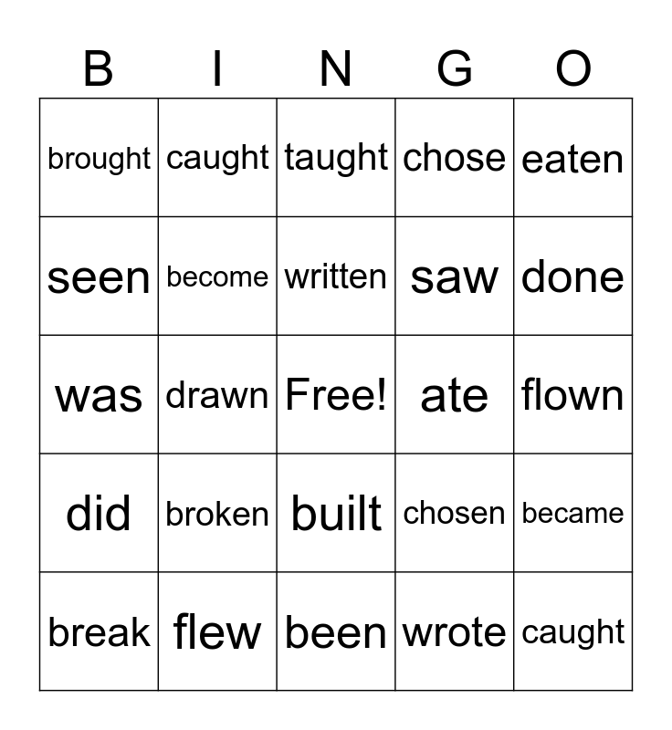 This bingo card has a free space and 24 words: break, broken, written, wrote, eaten, brought, caught, taught, ate, flown, was, become, chosen, became, seen, flew, been, chose, done, did, drawn, built, saw and caught.