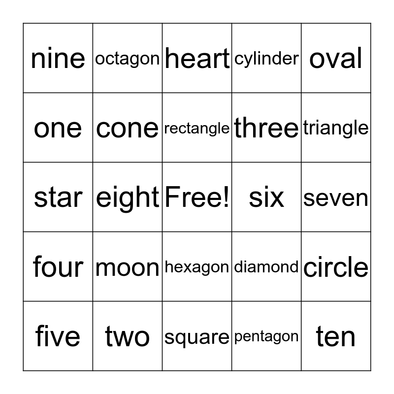 This bingo card has a free space and 24 words: moon, two, rectangle, five, oval, nine, one, octagon, six, hexagon, three, star, diamond, circle, cone, pentagon, seven, heart, triangle, eight, ten, four, cylinder and square.