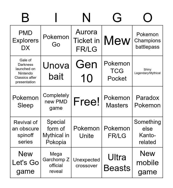 This bingo card has a free space and 24 words: Special form of Mythical in Pokopia, Mega Garchomp Z official reveal, Gen 10, New Let's Go game, Pokemon Champions battlepass, PMD Explorers DX, Gale of Darkness launched on Nintendo Classics after presentation, Pokemon Go, Pokemon Masters, Pokemon Unite, Pokemon TCG Pocket, Pokemon Sleep, Pokemon FR/LG, Something else Kanto-related, Unova bait, Ultra Beasts, Paradox Pokemon, Aurora Ticket in FR/LG, Shiny Legendary/Mythical, Completely new PMD game, New mobile game, Revival of an obscure spinoff series, Mew and Unexpected crossover.
