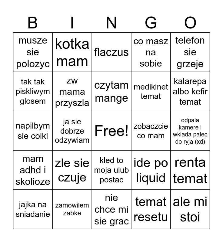 This bingo card has a free space and 24 words: zle sie czuje, zamowilem zabke, czytam mange, jajka na sniadanie, telefon sie grzeje, musze sie polozyc, tak tak piskliwym glosem, kotka mam, zobaczcie co mam, kled to moja ulub postac, medikinet temat, napilbym sie colki, ide po liquid, renta temat, zw mama przyszla, temat resetu, odpala kamere i wklada palec do ryja (xd), flaczus, kalarepa albo kefir temat, ja sie dobrze odzywiam, ale mi stoi, mam adhd i skolioze, co masz na sobie and nie chce mi sie grac.