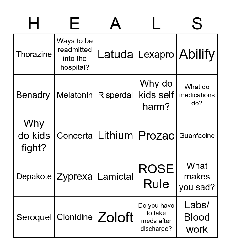 This bingo card has 25 words: Zyprexa, Zoloft, Risperdal, Seroquel, Abilify, Thorazine, Benadryl, Ways to be readmitted into the hospital?, Prozac, Lamictal, Why do kids self harm?, Why do kids fight?, ROSE Rule, What makes you sad?, Melatonin, Labs/ Blood work, Guanfacine, Latuda, What do medications do?, Concerta, Lithium, Clonidine, Depakote, Lexapro and Do you have to take meds after discharge?.