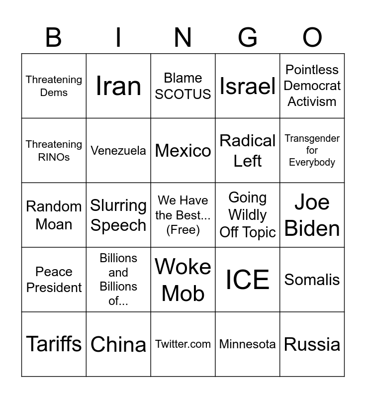This bingo card has a free space and 24 words: Billions and Billions of..., China, Mexico, Tariffs, Pointless Democrat Activism, Threatening Dems, Threatening RINOs, Iran, Going Wildly Off Topic, Woke Mob, Radical Left, Random Moan, ICE, Somalis, Venezuela, Minnesota, Joe Biden, Blame SCOTUS, Transgender for Everybody, Slurring Speech, Russia, Peace President, Israel and Twitter.com.